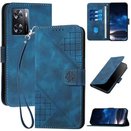 Funda de Cuero con Tapa y Cordón para Oppo A57 4G Yx0080 con Diseño En Relieve de Mariposa y Cuadrícula (Azul Oscuro)