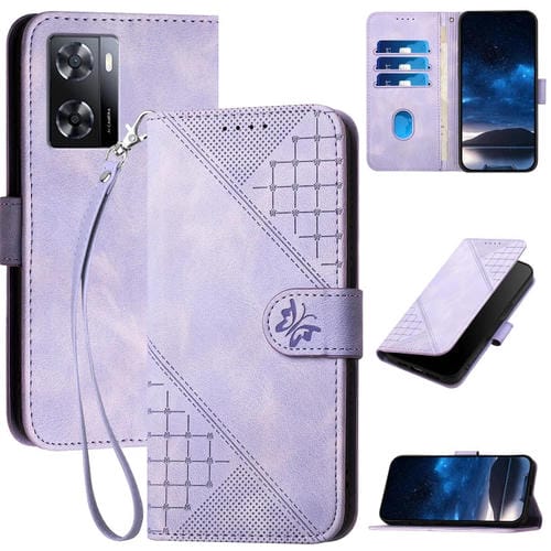 Funda de Cuero con Tapa y Cordón para Oppo A57 4G Yx0080 con Diseño En Relieve de Mariposa y Cuadrícula (Morado Claro)