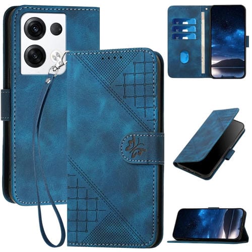Funda de Cuero con Tapa y Cordón para Oppo Reno10 Pro 5G Global Yx0080 con Diseño En Relieve de Mariposa y Cuadrícula (Azul Oscuro)