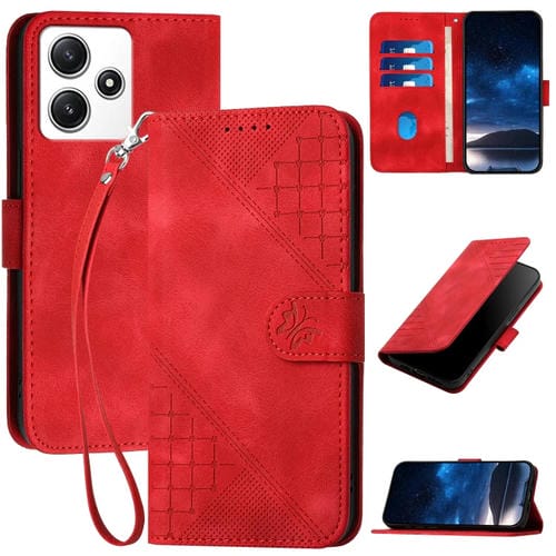 Funda de Cuero con Tapa y Cordón para Redmi 12 5G Yx0080 con Diseño En Relieve de Mariposa y Cuadrícula (Rojo)