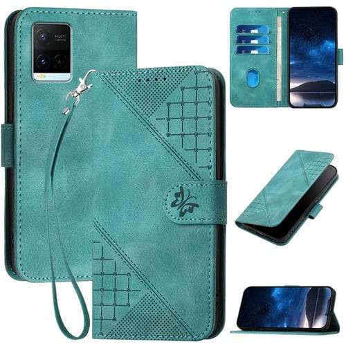 Funda de Cuero con Tapa y Cordón para Vivo Y33S 4G Global Yx0080 con Diseño En Relieve de Mariposa y Cuadrícula (Azul Claro)