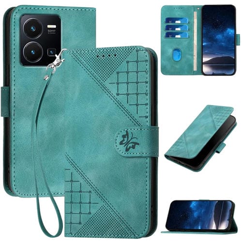 Funda de Cuero con Tapa y Cordón para Vivo Y35 4G Global Yx0080 con Diseño En Relieve de Mariposa y Cuadrícula (Azul Claro)