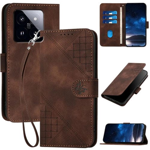 Funda De Cuero Con Tapa Y Cordón Para Xiaomi 14 Pro Yx0080 Con Diseño De Mariposa En Relieve Y Cuadrícula (Café)