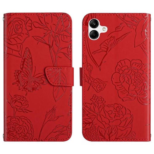 Funda de Cuero con Tapa para Samsung Galaxy A06 5G Diseño Mariposas En Relieve (Rojo)