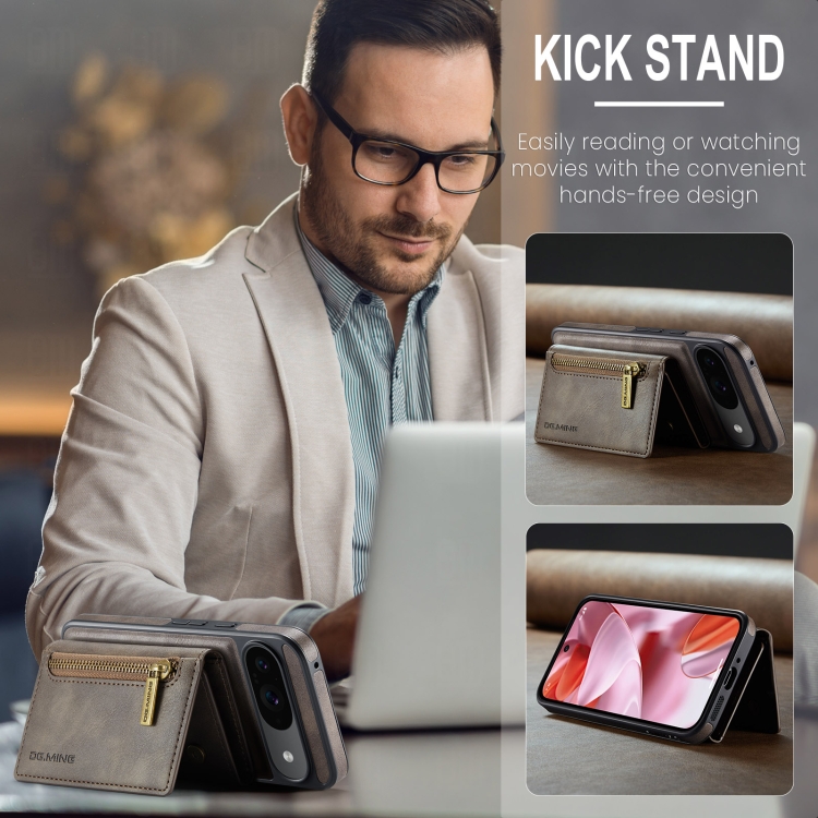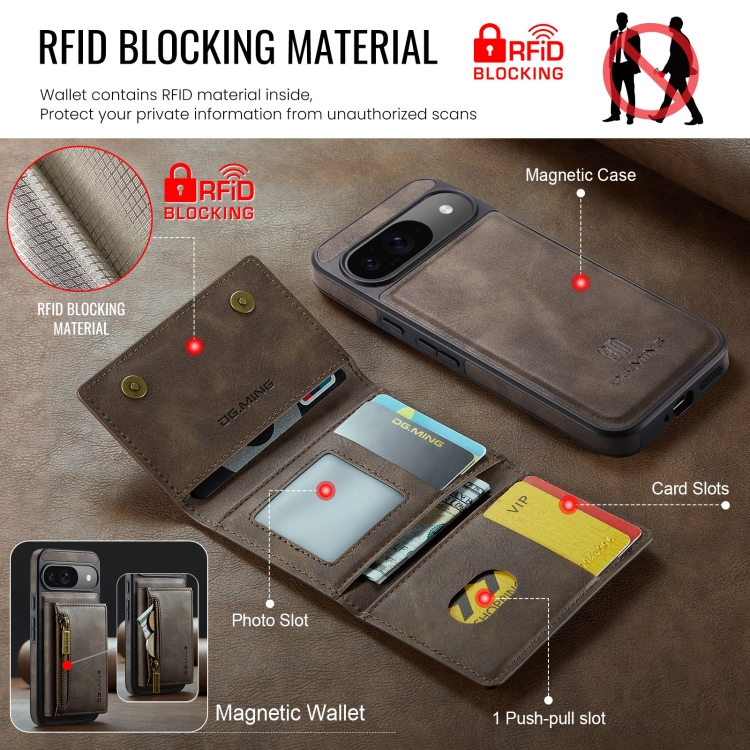 Funda de Cuero Desmontable con Cremallera RFID para Google Pixel 9 y 9 Pro Dg.Ming M5 Series (Café)
