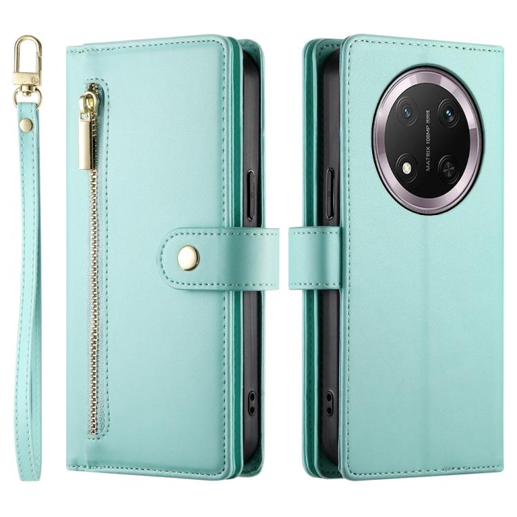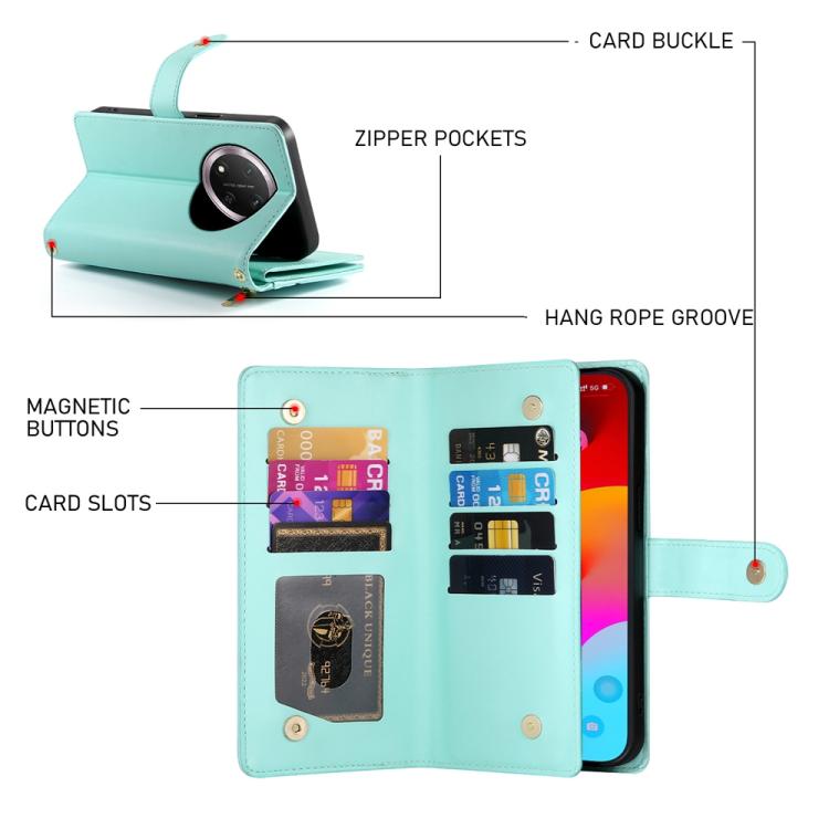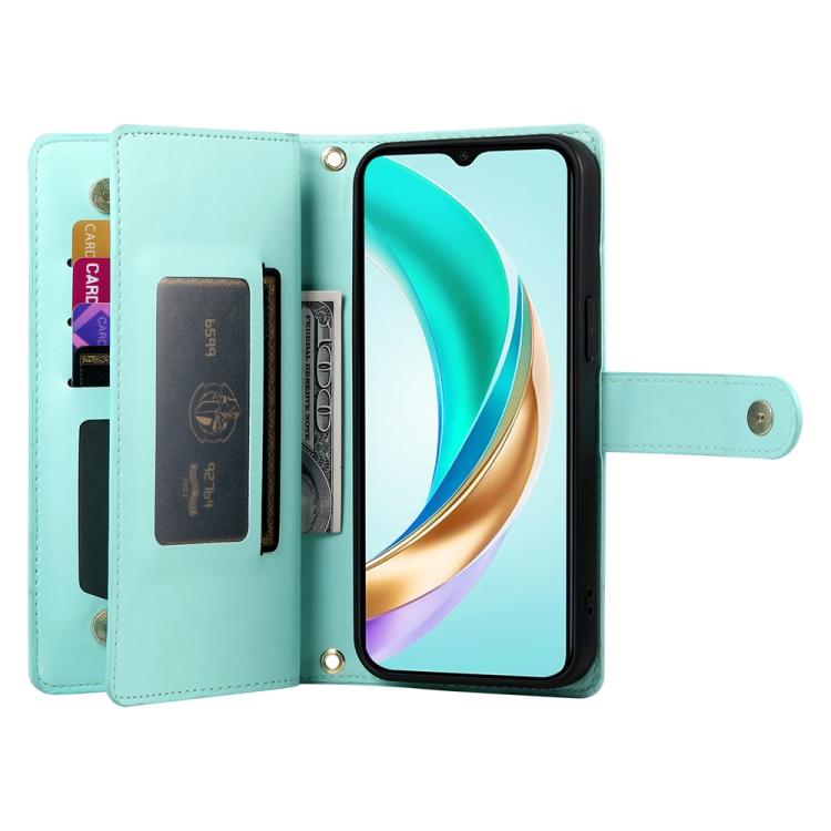 Funda de Cuero para Honor X9C Global y Magic7 Lite con 9 Ranuras y Cremallera (Verde Menta)