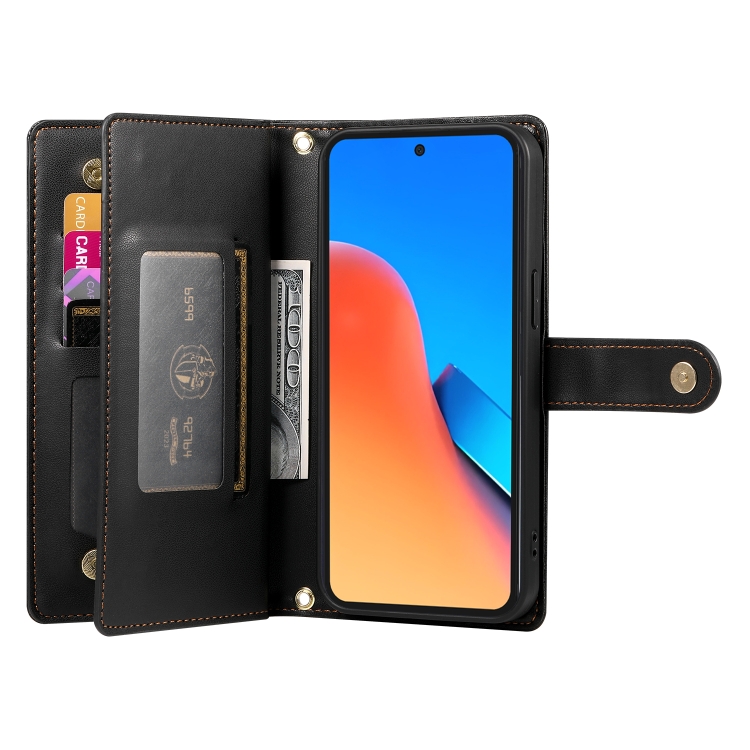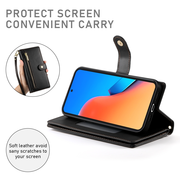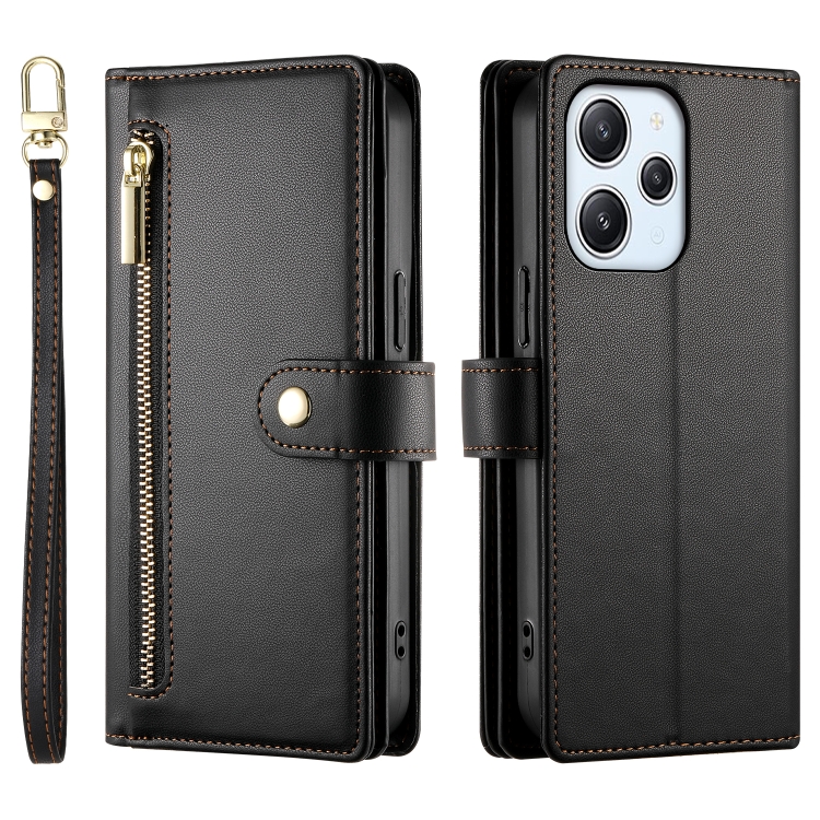 Funda de Cuero para Teléfono Redmi 12 5G/4G/Note 12R con Nueve Ranuras para Tarjetas y Cremallera (Negra)