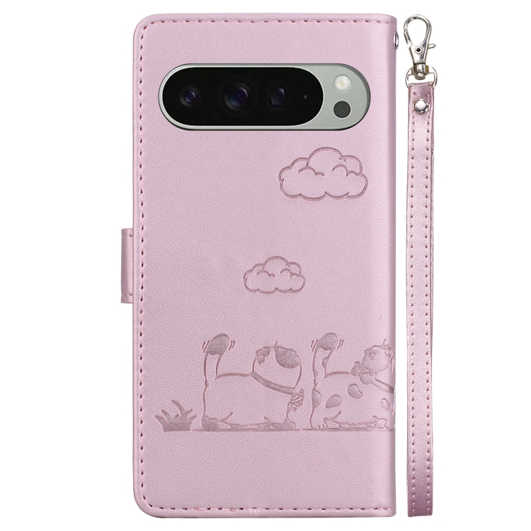 Funda de Cuero Rfid para Google Pixel 9 y 9 Pro con Diseño de Gatos (Oro Rosa)