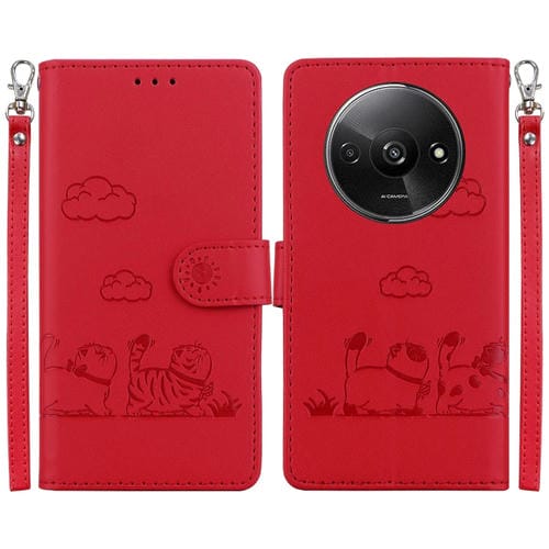 Funda de Cuero Rfid con Diseño de Gatos para Redmi A3 (Roja)