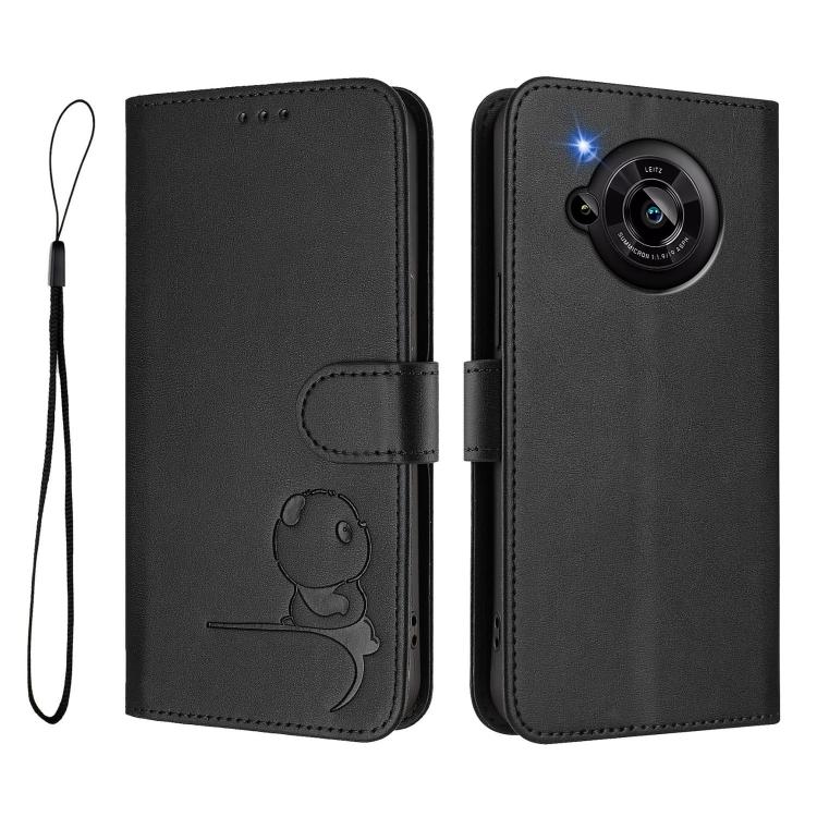 Funda de cuero RFID con estampado de panda y cordón para Sharp Aquos R7 SH-52C (negro)
