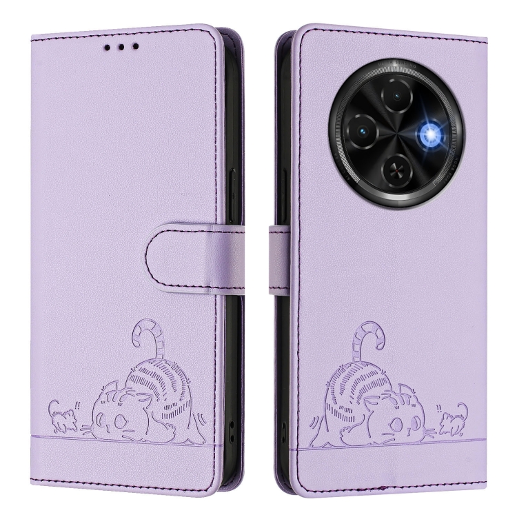 Funda de Cuero Rfid para Tecno Spark 30C con Estampado de Rata y Gato En Relieve y Cordón (Morado)