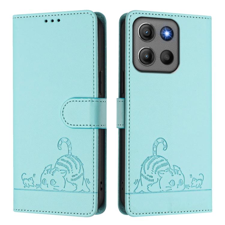 Funda de cuero RFID con estampado de rata y gato para Motorola Moto G15 / G15 Power con cordón (verde menta)