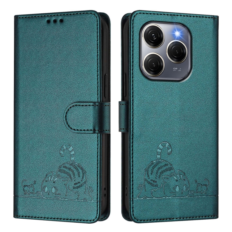 Funda de Cuero RFID para Tecno Spark 20 Pro 5G con Patrón de Gato y Rata y Cordón (Verde Pavo Real)