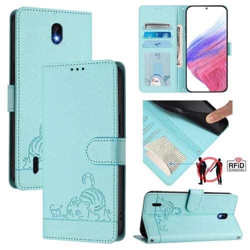 Funda Cuero Rfid Nokia C01 Plus C1 2.ª Edición Relieve Rata y Gato con Cordón (Verde Menta)