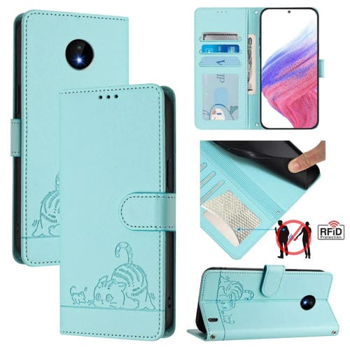 Funda de Cuero Rfid para Nokia C10/C20 con Relieve de Rata y Gato y Cordón (Verde Menta)