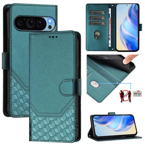 Funda de Cuero Rfid con Relieve en Panal para Google Pixel 9 Pro XL (Verde Pavo Real)