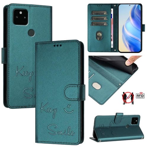 Funda de Cuero Rfid con Relieve Sonriente para Google Pixel 5A (Verde Pavo Real)