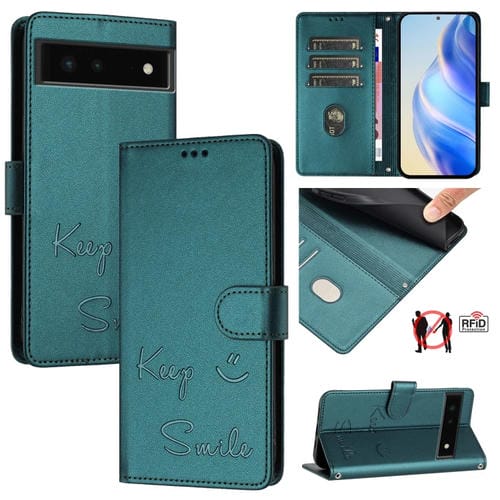 Funda de Cuero Rfid con Relieve Sonriente para Google Pixel 6 (Verde Pavo Real)