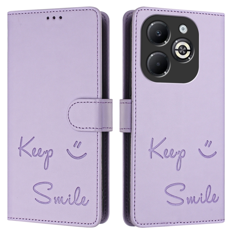Funda de Cuero Rfid con Relieve Sonriente para Infinix Smart 8 Plus y Smart 8 Pro (Morado Claro)