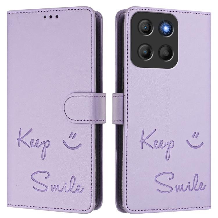 Funda de Cuero Rfid con Relieve Sonriente para Motorola Moto G15 (Morado Claro)