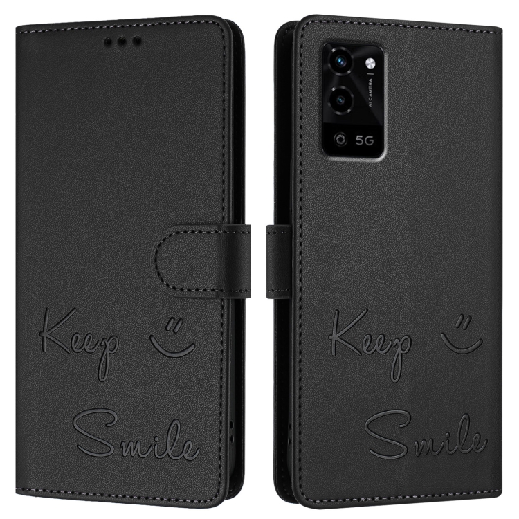 Funda de Cuero Rfid con Relieve Sonriente para Oppo A54 4G/A54S/A55 5G (Negra)