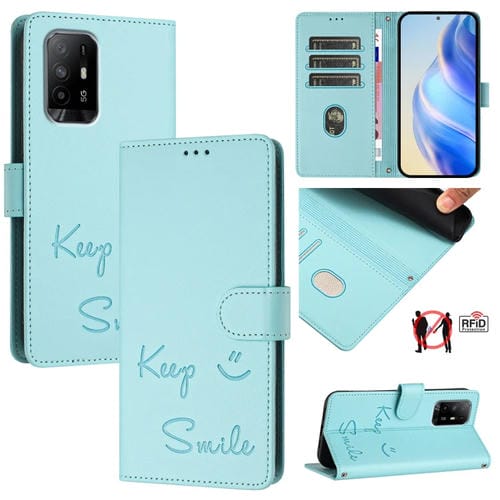 Funda de Cuero Rfid con Relieve Sonriente para Oppo A74 4G/F19/F19S (Verde Menta)