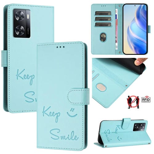 Funda de Cuero Rfid con Relieve Sonriente para Oppo A77 4G/A77S 4G (Verde Menta)