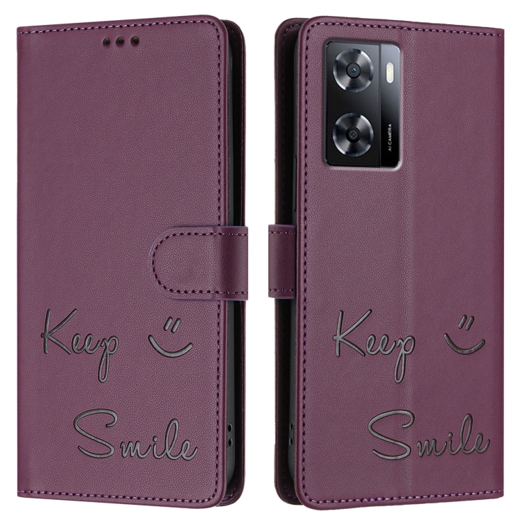 Funda de Cuero Rfid con Relieve Sonriente para Oppo A77 4G/A77S 4G (Violeta)
