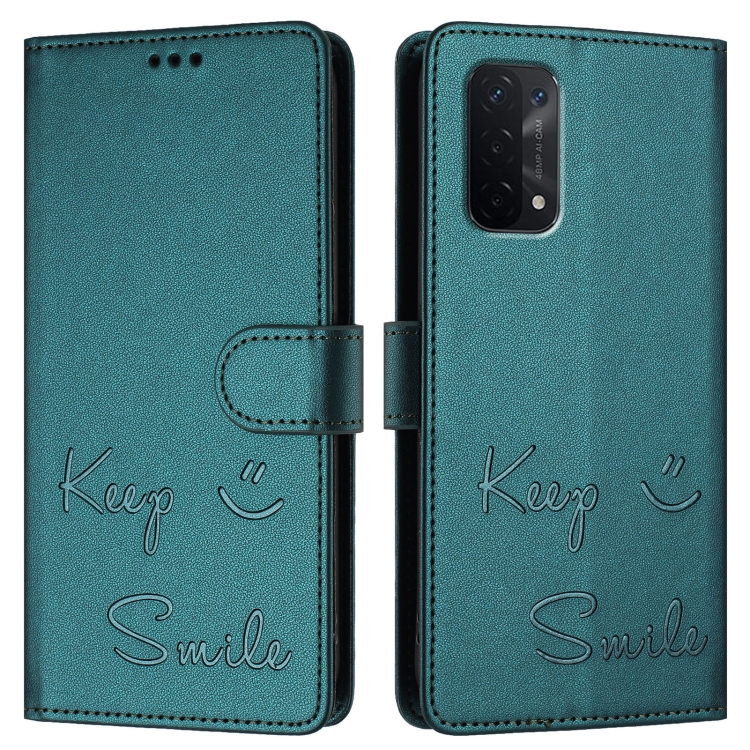 Funda de Cuero Rfid con Relieve Sonriente para Oppo A77 5G/A97 5G (Verde Pavo Real)