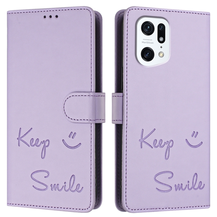 Funda de Cuero Rfid con Relieve Sonriente para Oppo Find X5 Pro (Morado Claro)