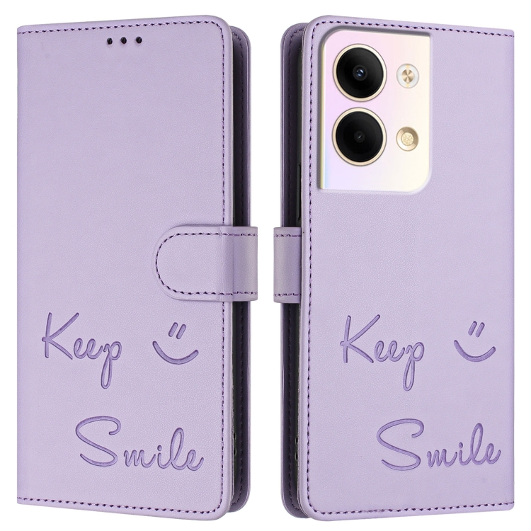 Funda de Cuero Rfid con Relieve Sonriente para Oppo Reno 9 5G/Reno 9 Pro 5G (Morado Claro)
