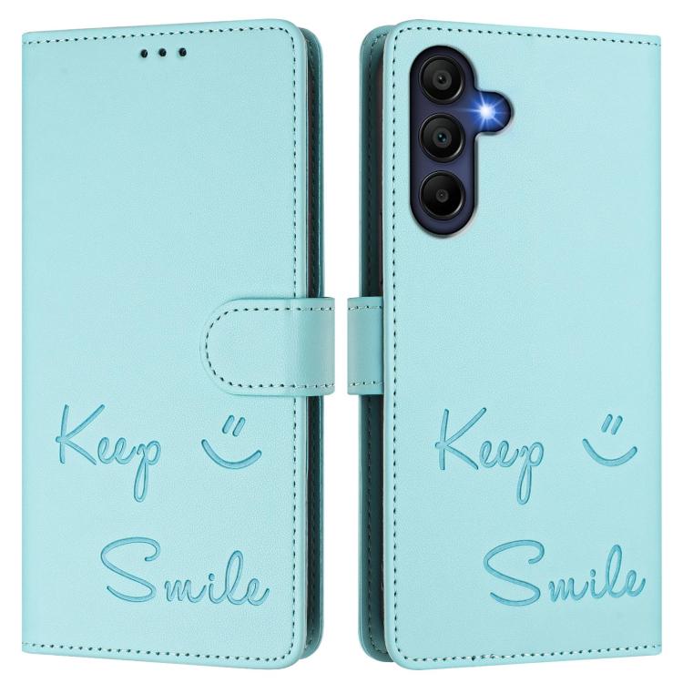 Funda de cuero RFID con relieve sonriente para Samsung Galaxy A17 4G (verde menta)