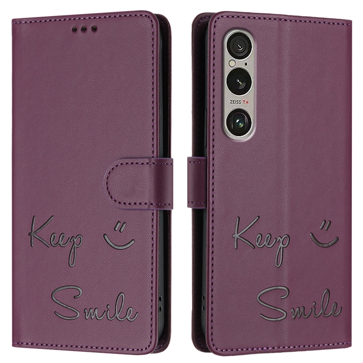 Funda de Cuero Rfid para Sony Xperia 1 Vi con Relieve Sonriente (Violeta)