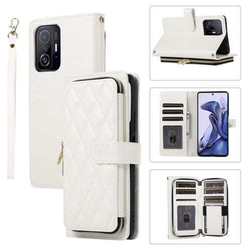 Funda de Cuero Tipo Billetera con Cremallera Completa y Diseño Rombal para Xiaomi Mi 11T/11T Pro (Blanca)