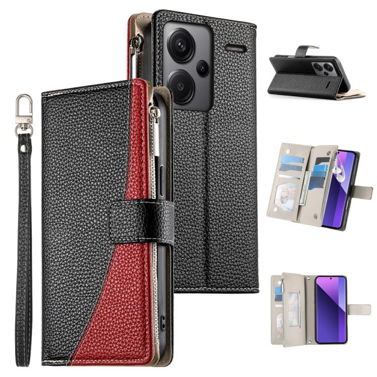 Funda de cuero tipo billetera con cremallera para Redmi Note 13 Pro+, con costuras globales y múltiples tarjetas, con correa corta (negra)