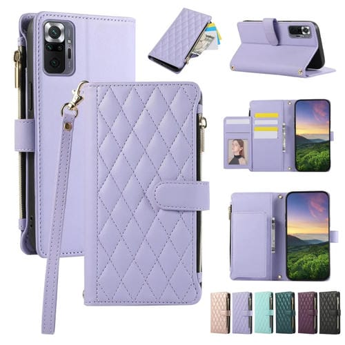 Funda de Cuero Tipo Billetera con Cremallera Rombal para Redmi Note 10 Pro/10 Pro Max (Morado)