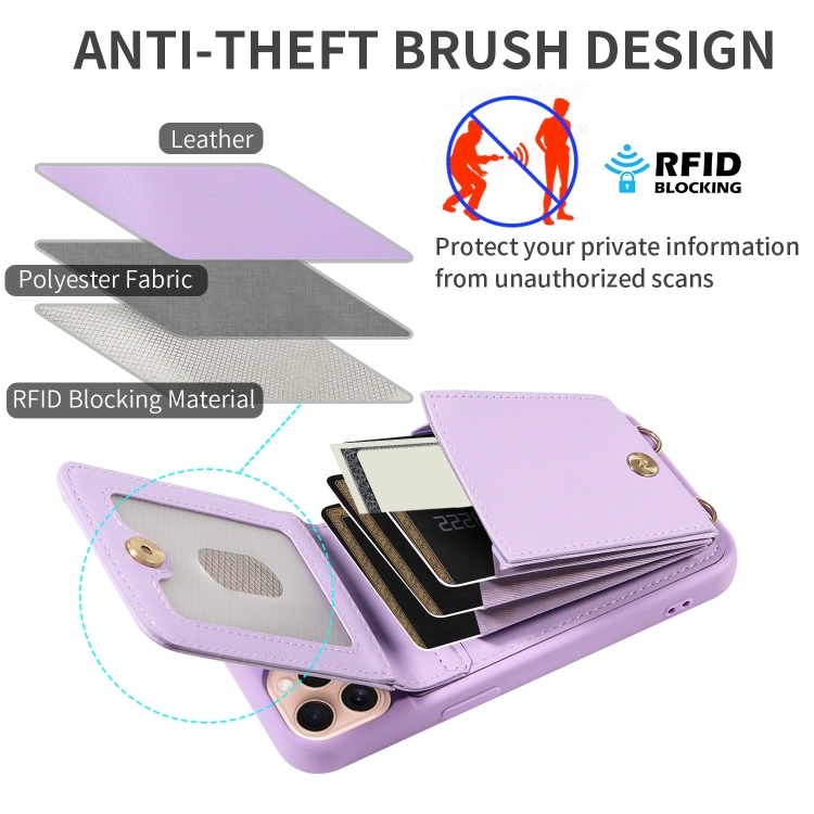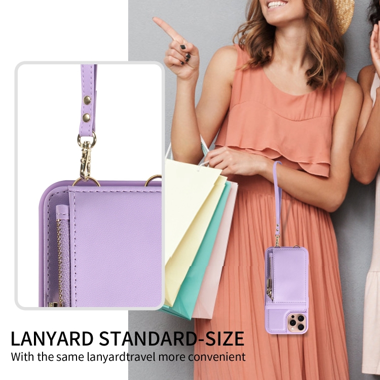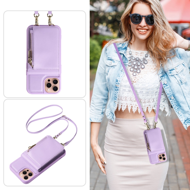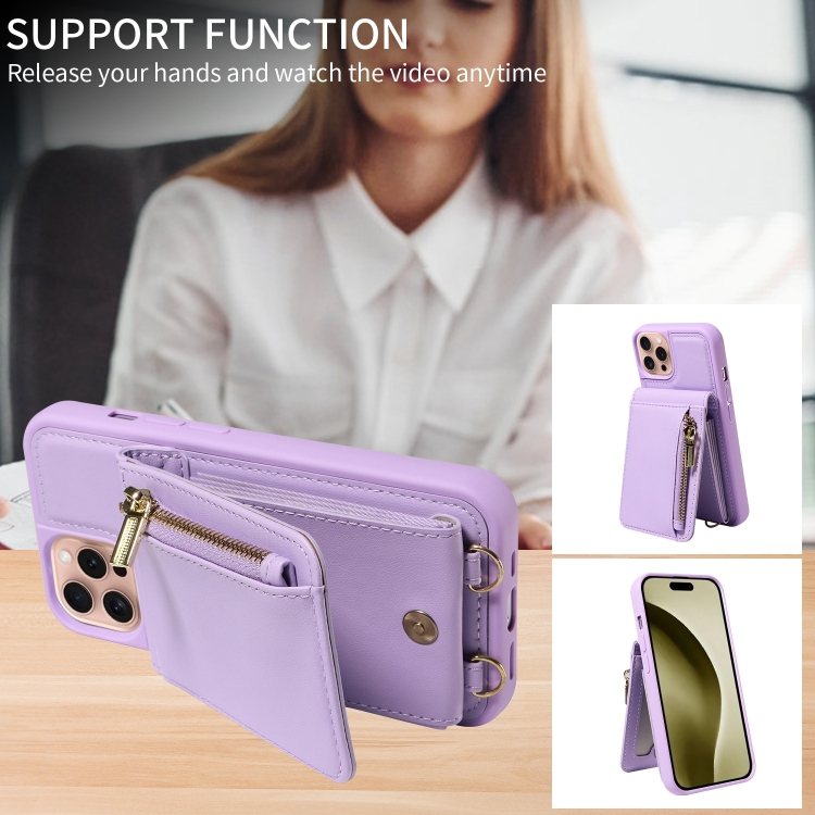 Funda de Cuero Tipo Billetera con Cremallera y Cordón Cruzado para iPhone 16 Pro (Morado)