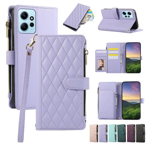 Funda de Cuero Tipo Billetera con Cremallera y Diseño Rombal para Redmi Note 12 4G (Morado)