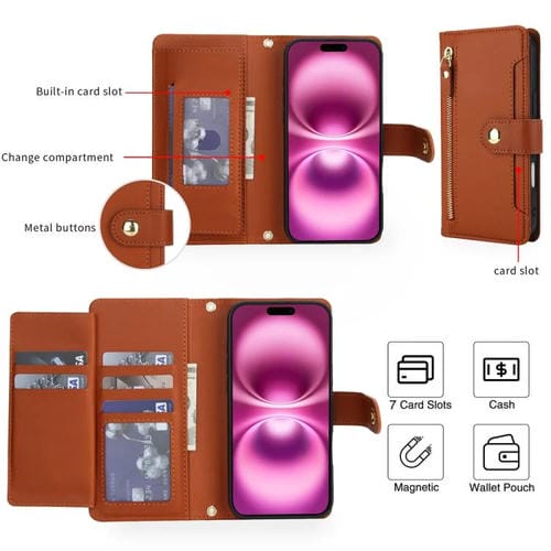 Funda de cuero tipo billetera con cremallera y siete ranuras para tarjetas para iPhone 17 (marrón)