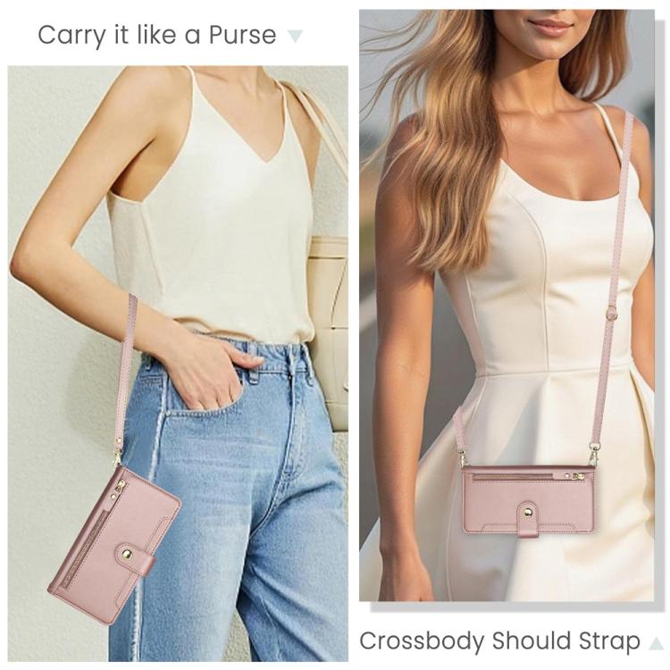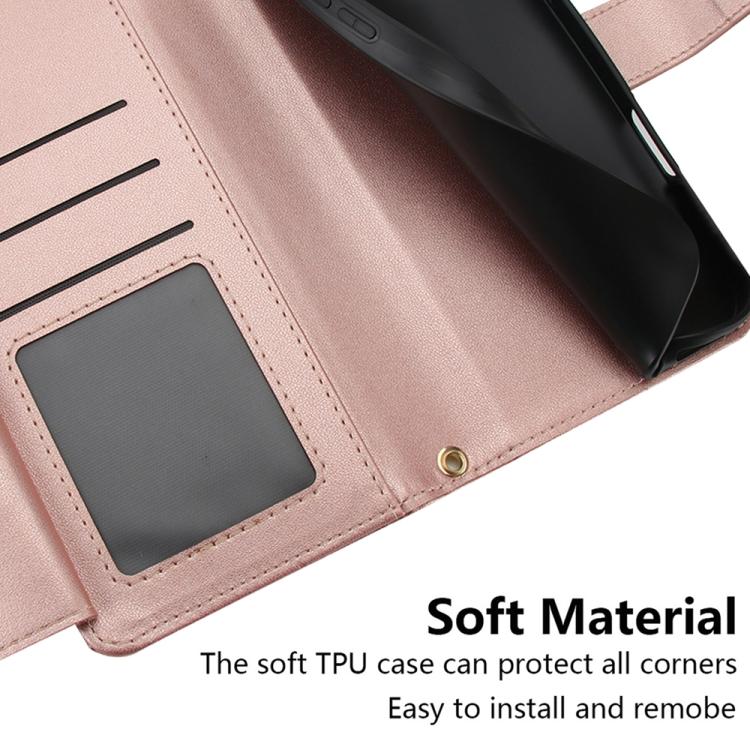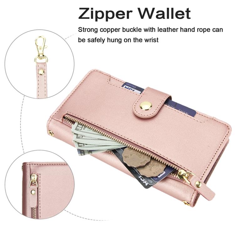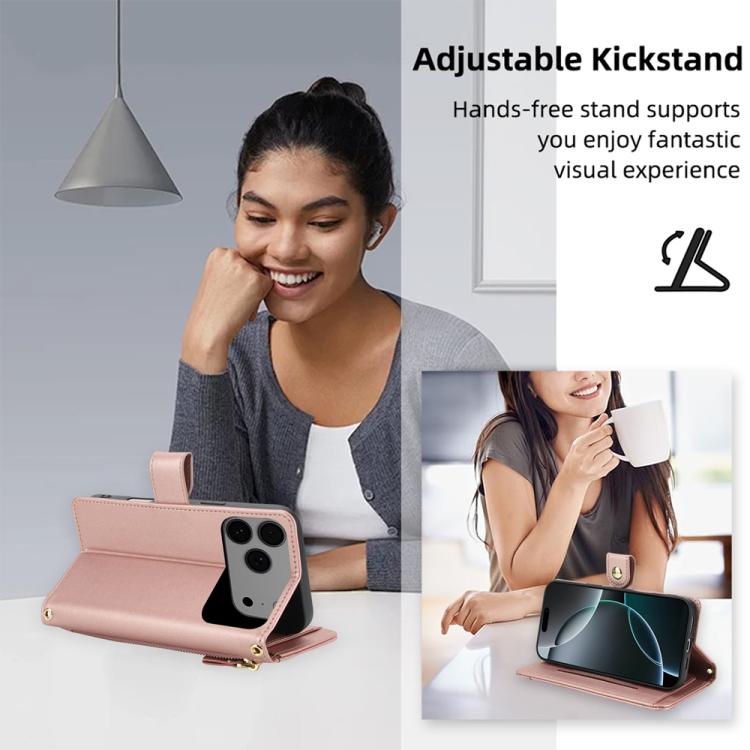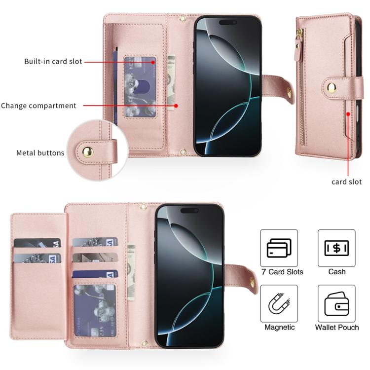 Funda de cuero tipo billetera con cremallera y siete ranuras para tarjetas para iPhone 17 Pro (oro rosa)