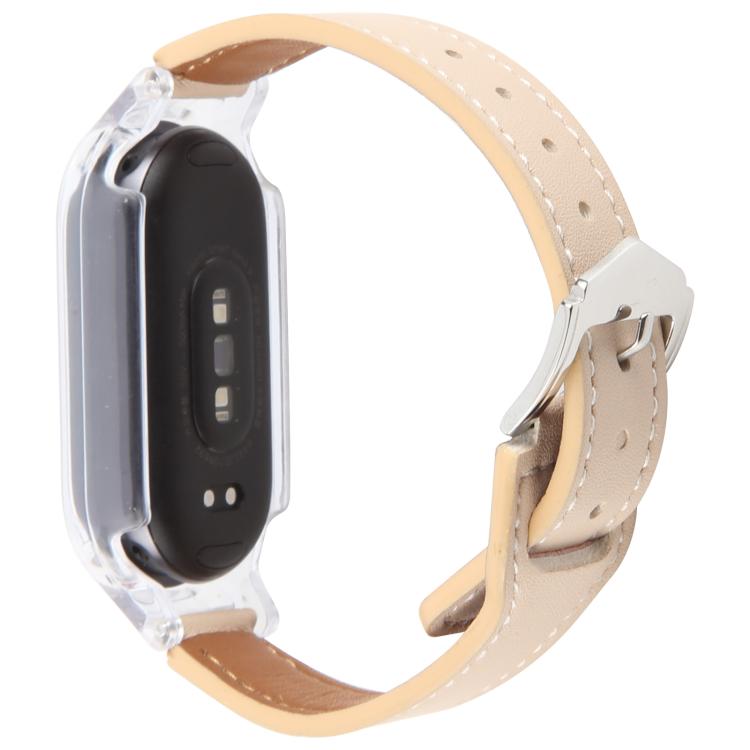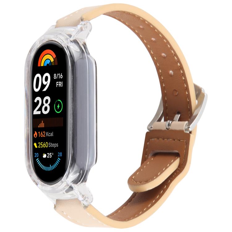 Funda de PC para Xiaomi Smart Band 9 con correa de cuero de microfibra integrada (transparente y blanco retro)