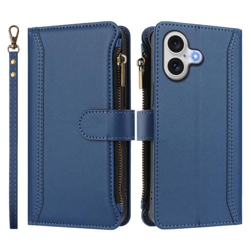 Funda de piel con cierre magnético para iPhone 17, 9 ranuras para tarjetas, cremallera y correa de mano (azul oscuro)