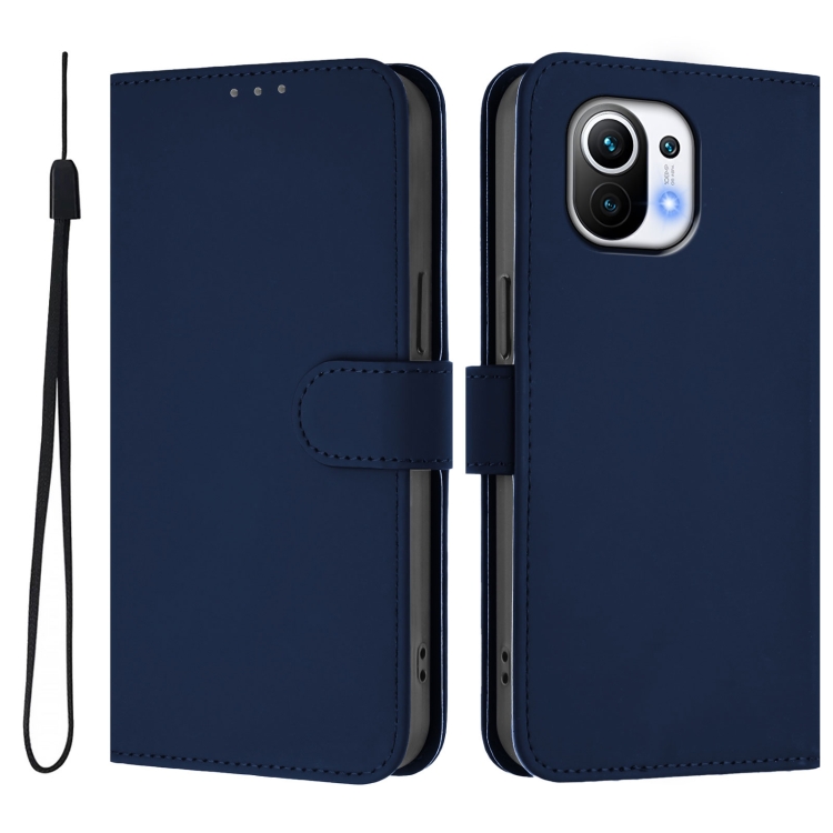 Funda de Piel con Cordón para Teléfono Xiaomi Mi 11 Skin Feel de Color Liso (Azul Marino)