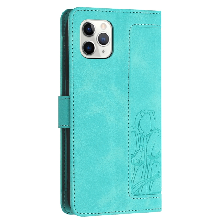 Funda de Piel con Relieve de Tulipanes para iPhone 11 Pro con Cordón (Verde)