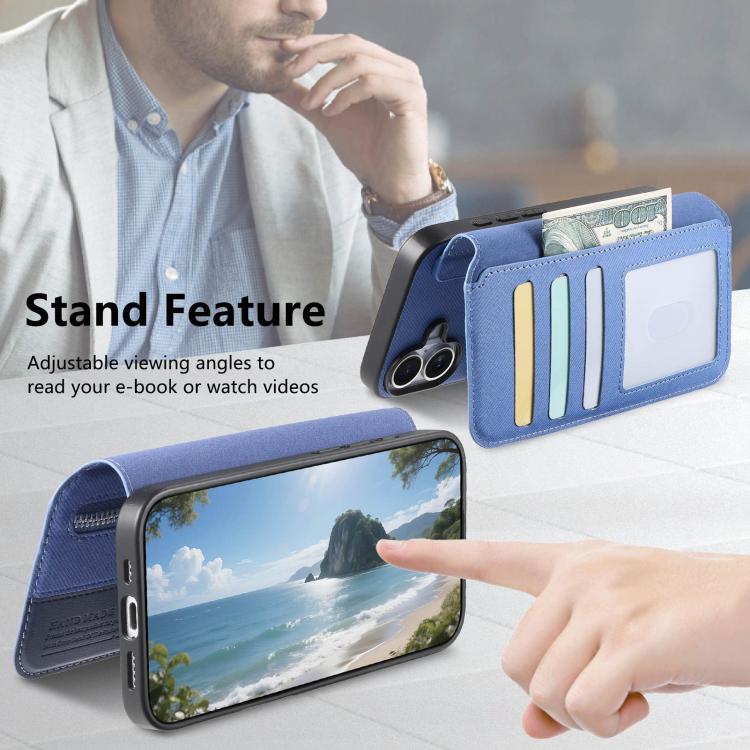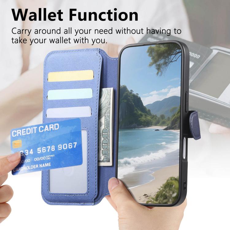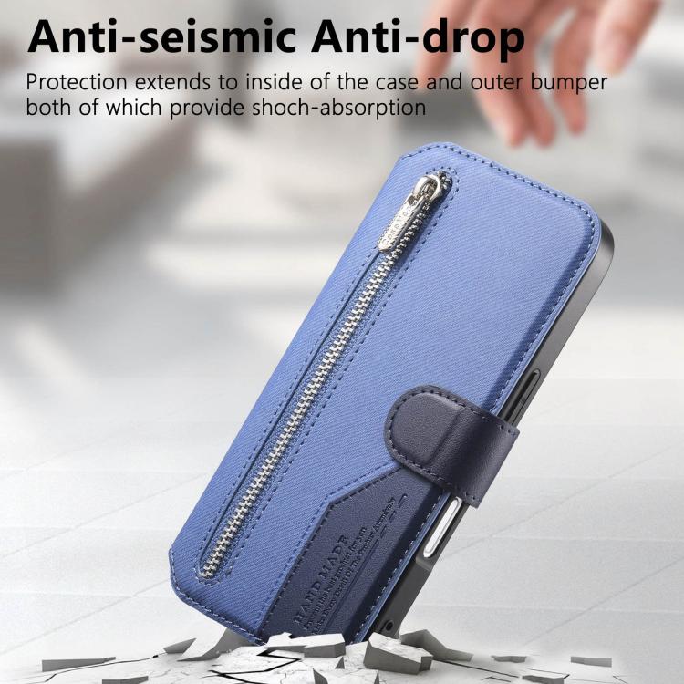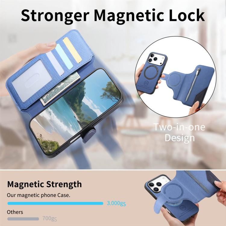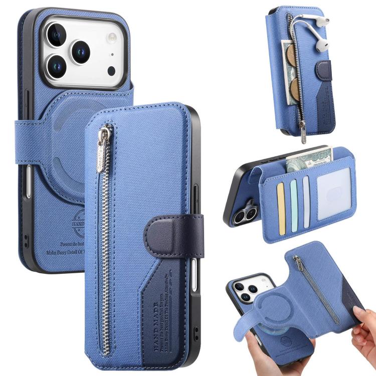 Funda de piel para iPhone 17 Pro, de tela de sarga, con MagSafe, RFID, antirrobo y cremallera (azul oscuro).