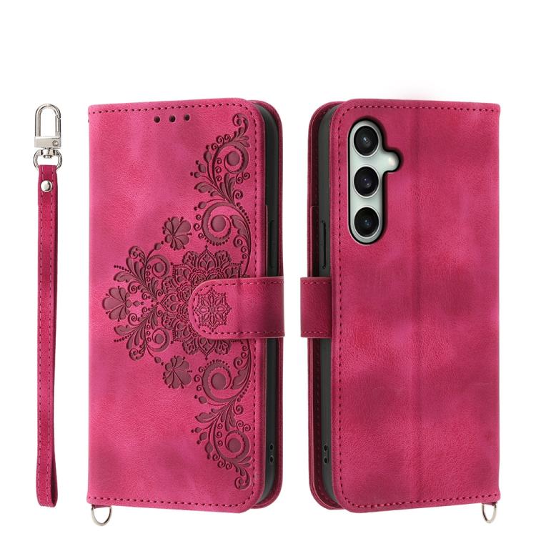 Funda de piel tipo billetera con diseño de flores en relieve para Samsung Galaxy S25 FE 5G (rojo vino)