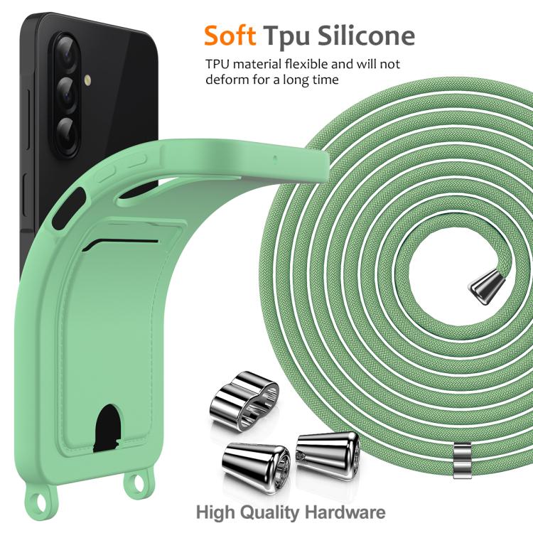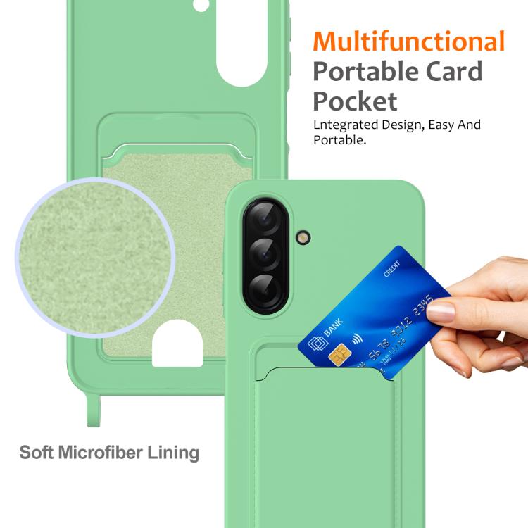 Funda de silicona líquida con cordón para Samsung Galaxy A17 5G, color sólido, con tarjetero integrado (verde)