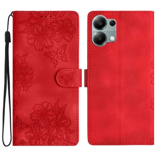 Funda de Teléfono de Pu con Relieve de Piel de Mariposa y Diseño de Flor de Cerezo para Redmi Note 13 Pro 4G (Rojo)