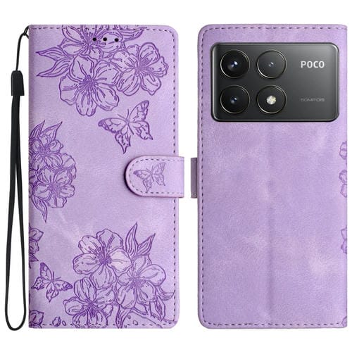 Funda de Teléfono de Pu con Relieve de Piel de Mariposa y Diseño de Flor de Cerezo para Xiaomi Poco F6 Pro (Morado)