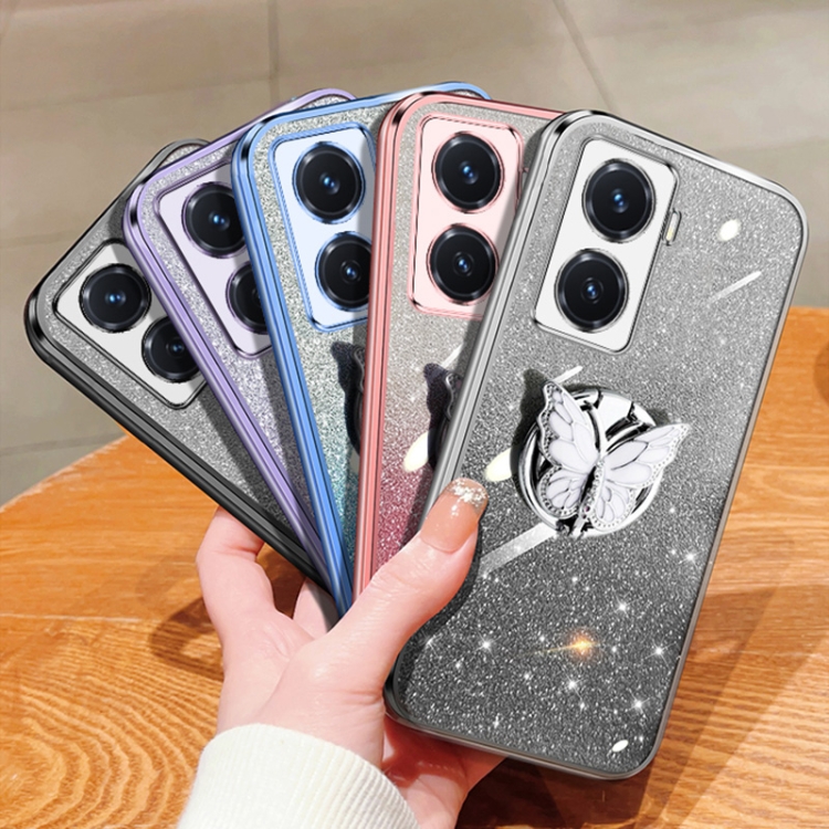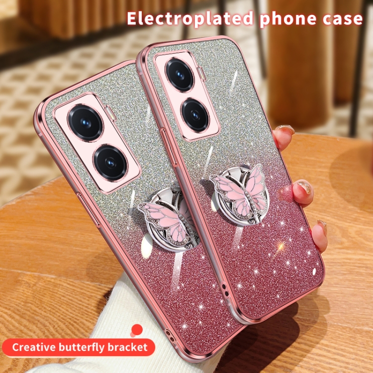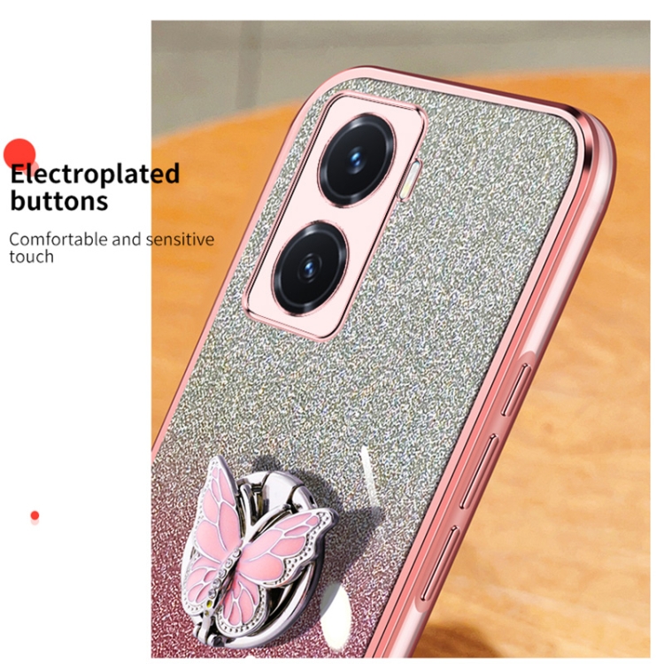 Funda de Teléfono de TPU con Soporte de Mariposa con Purpurina Degradada Plateada para Vivo Y77 5G (Plateada)